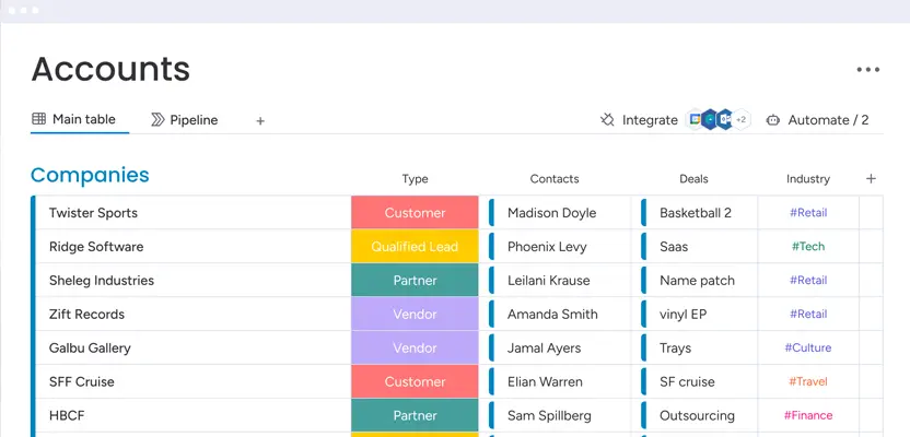 Op basis daarvan is monday.com ingericht als volwaardig CRM, opgebouwd uit vier samenhangende onderdelen: een heldere leadfunnel, centrale accounts, duidelijke opportunities en één plek voor alle salesactiviteiten. Zo ontstaat samenhang zonder dat sales hoeft te zoeken of te schakelen tussen boards.