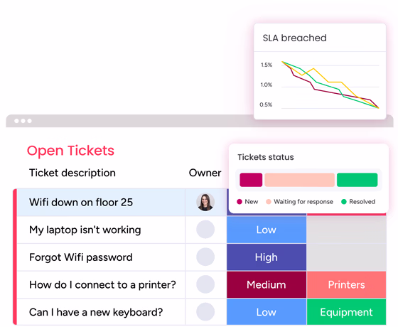 Daardoor ontbreekt overzicht, krijg je dubbel werk, en is het lastig om prioriteiten, eigenaarschap en SLA’s te bewaken. monday service brengt alles samen in één proces dat past bij jouw organisatie: van MKBs tot enterprise en van ‘nieuw met tooling’ tot volwassen ITSM/ESM.